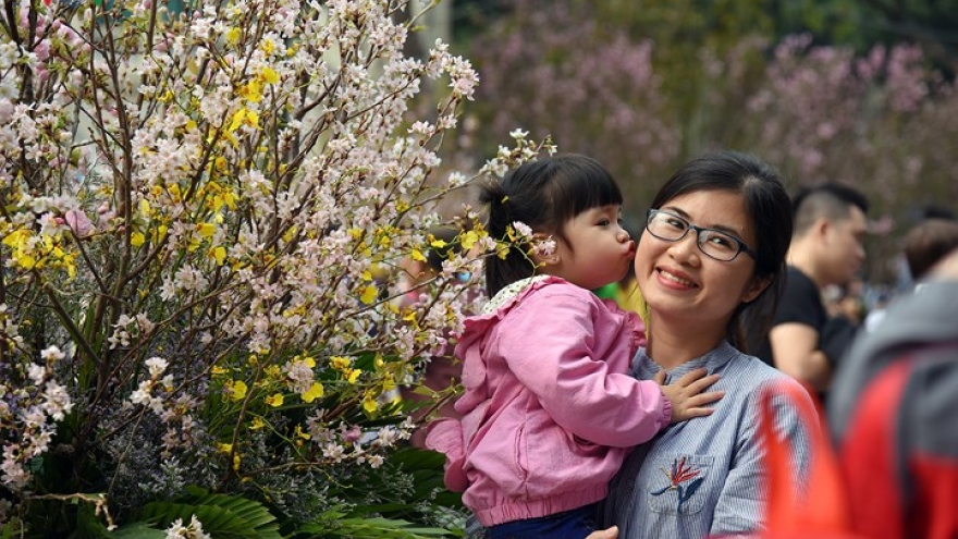 Around 50 cherry blossom trees and 30,000 blossom branches are being displayed at Ly Thai To Square, Hoan Kiem district, along with various types of flowers planted in Vietnam.